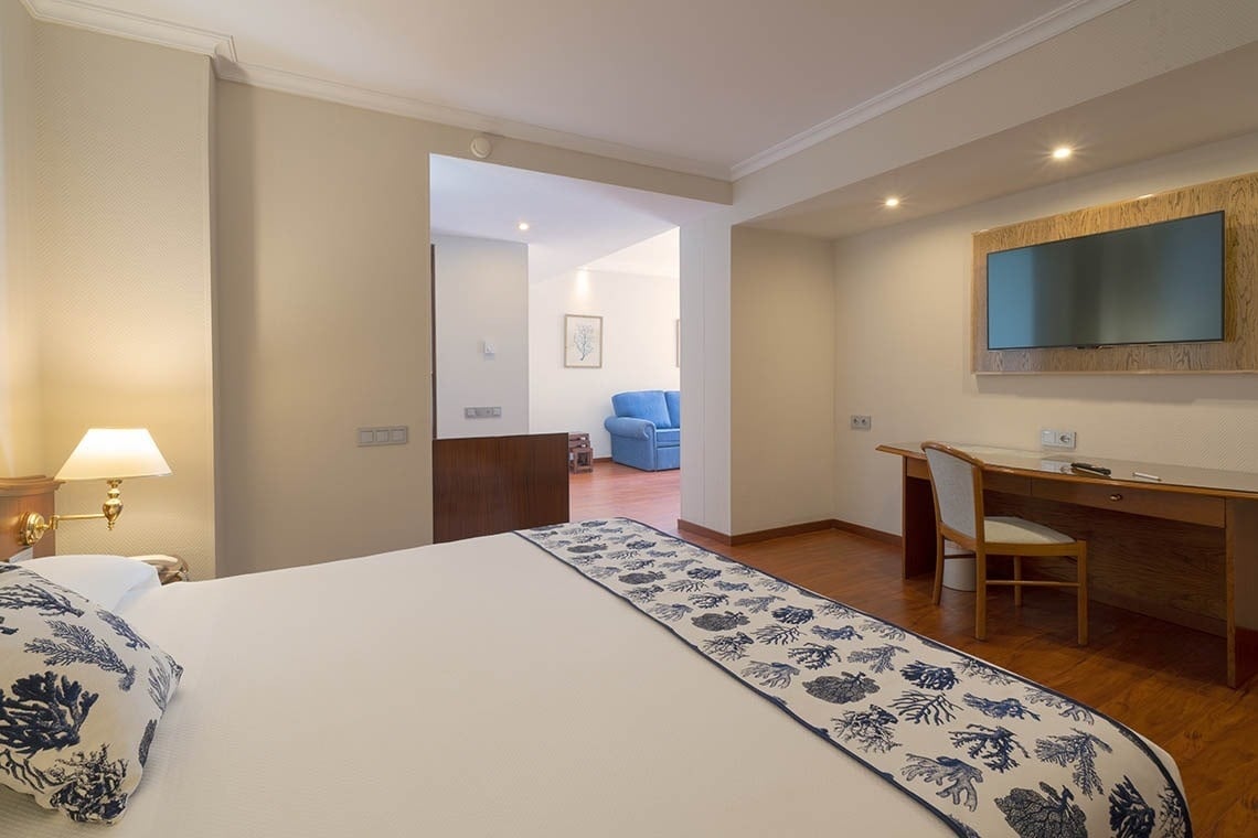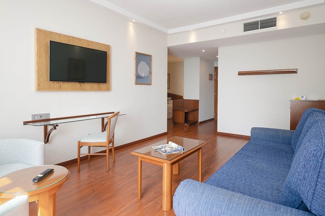 El Hotel dispone de 6 Junior Suites de amplias dimensiones y situadas todas en zonas distintas del hotel, para que puedan satisfacer todos los gustos. Disponen de 1 dormitorio con cama doble, salón con sofá cama y 2 pantallas de plasma con canales vía satélite.